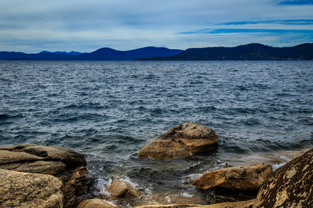 My other objective, to check on the progress of the Nevada Lake Tahoe State Park was also successful. For the past couple of years, whenever we were visiting Lake Tahoe, I would drive north around the east side of the lake, first on US 50 and then onto Nevada 28. This trip of about 40 minutes from South Lake Tahoe, was intended to stop at Memorial Point — a public parking location, including restrooms, along 28 which also provided access to rustic hiking paths close to the surface of the lake and an excellent starting point for good photo opportunities. But over these two years, it has been closed to public access, instead being used as a staging area for construction vehicles and materials for the under way improvements.