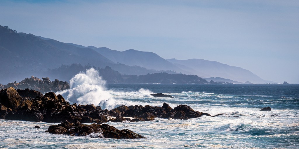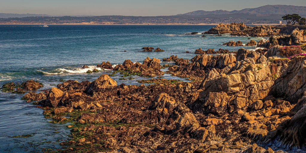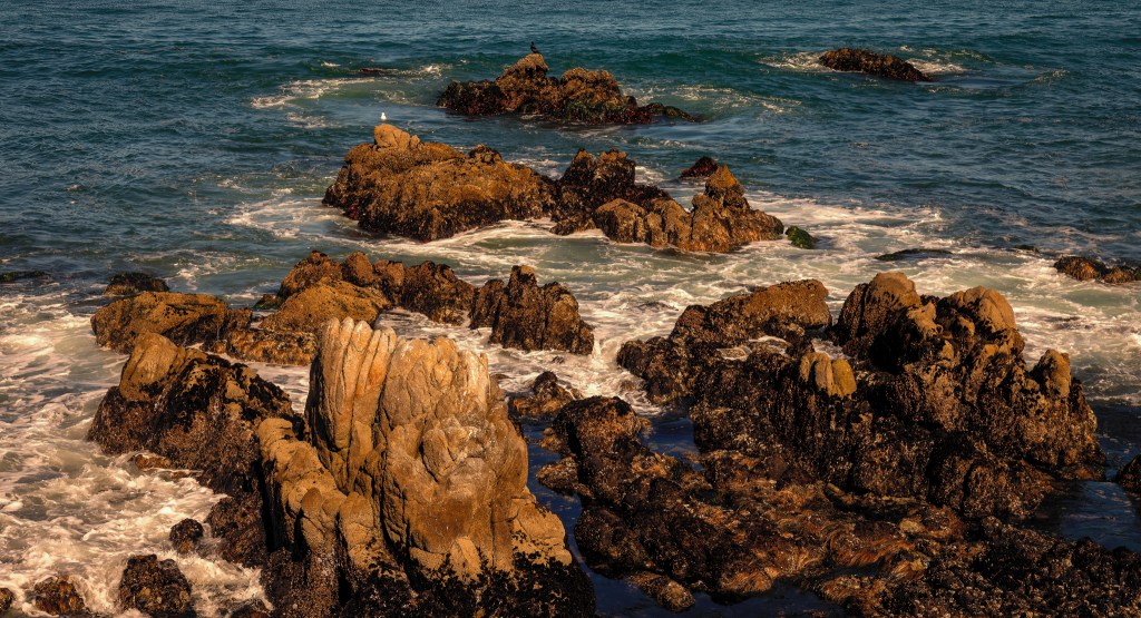 One day we were talking and realized that none of us had been on the famous 17-Mile Drive for many, many years (decades?). That drive, along the very well preserved natural and gorgeous coastline just south of Monterey which includes Spanish Bay, Pebble Beach, Spyglass Hill, the Lone Cypress, championship golf courses, luxury resorts, and many custom designed homes does require a fee for tourists like us. So we rented a tour-guide app for the trip and headed toward the northern Pacific Grove entrance to the drive. The tour guide app actually provided us with a tour of the drive approach through Monterey and Pacific Grove along Ocean View Boulevard (primarily the somewhat protected southern edge of Monterey Bay) and then Sunset Drive (directly facing the Pacific Ocean) right up to the gate. Later in the day, we drove back to Ocean View Blvd and I grabbed a couple of late afternoon shots from that fairly calm, protected section of Monterey Bay.
