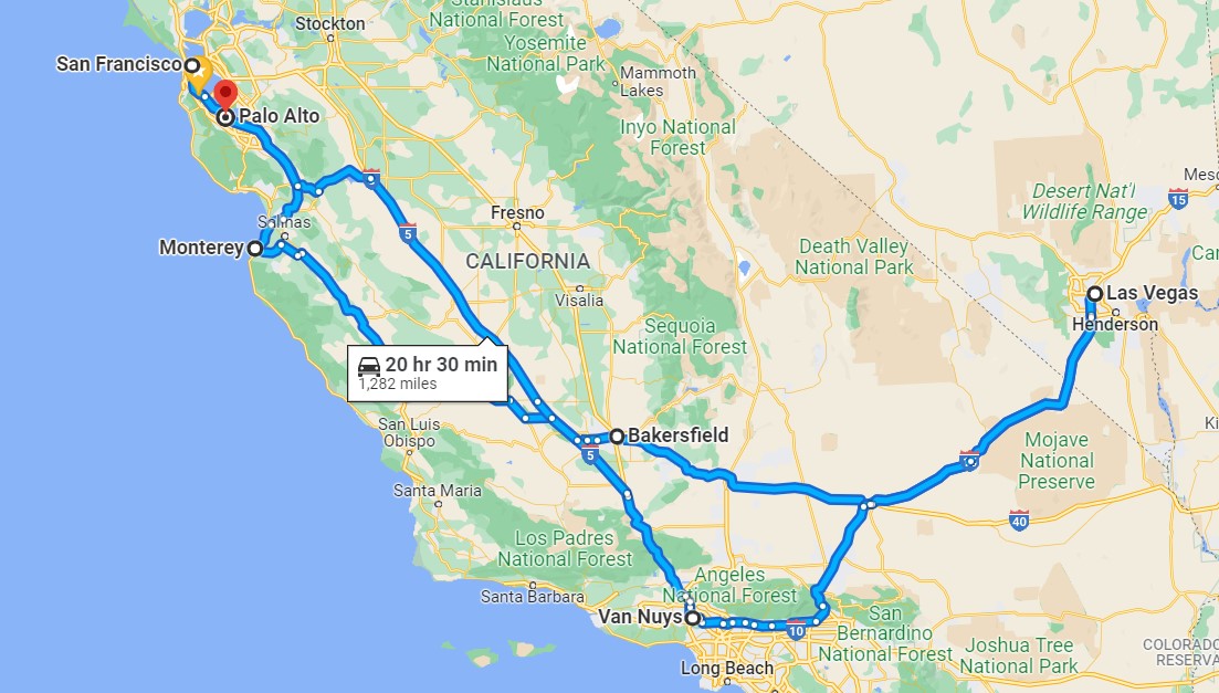 Basically, the road trip was to San Francisco, Monterey, and Las Vegas with side trips in the vicinity of each location and finally, of course, a return home (image courtesy of Google Maps).