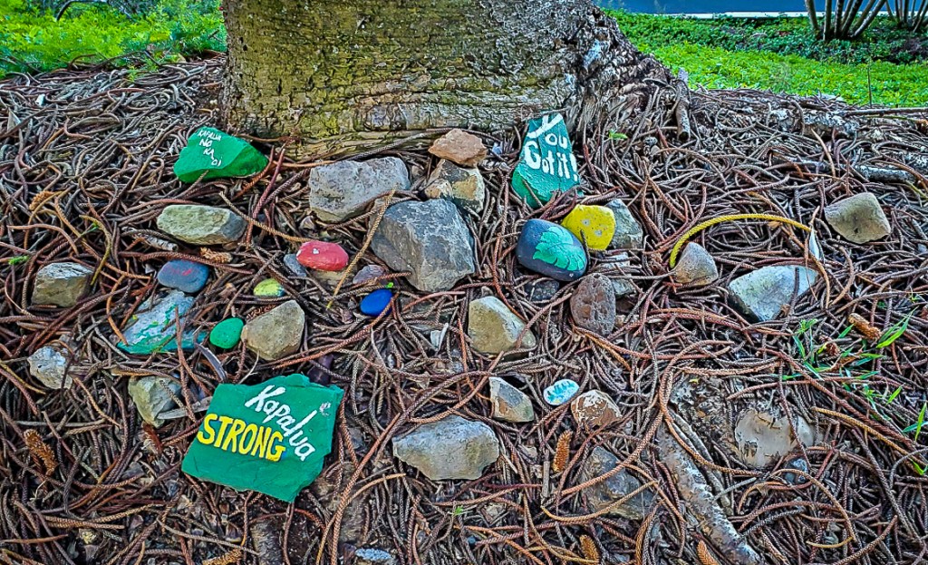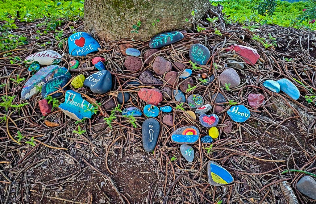 Going up Kapalua Drive I noticed three trees (of the many which line that road) under which some decorated rocks had been placed. I don’t know if this was a school project, or perhaps the result of a kids-camp arts and crafts session, or something else. But they struck me as kind of cheery and worth recording (these images can be clicked to see them larger).