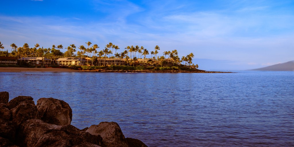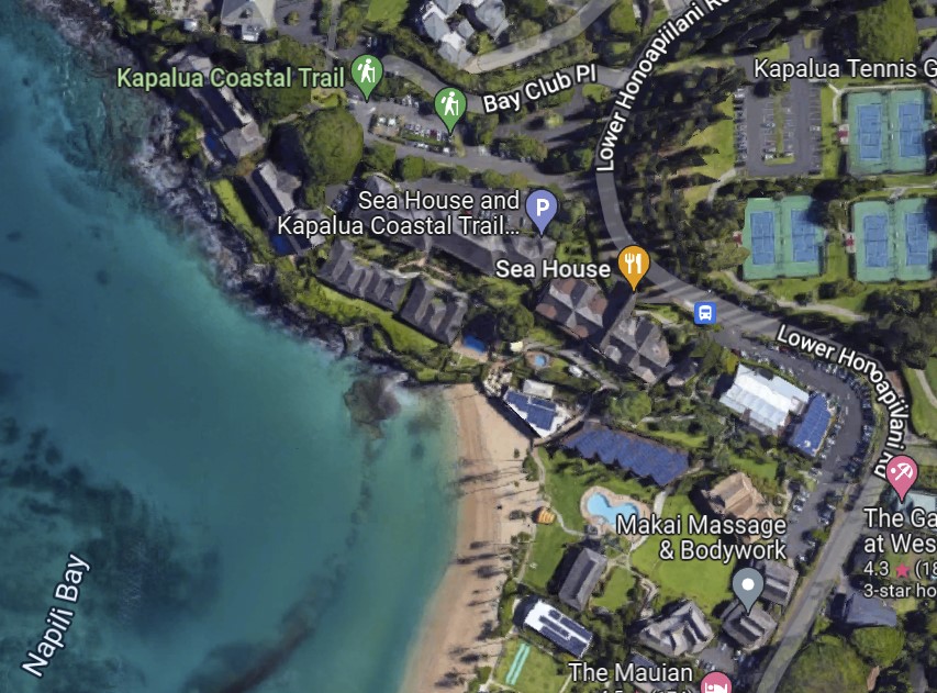 These two Google annotated satellite-view maps provide (1) a view of the region (Napili Bay is visible in the lower left) and (2) a close-up of the resort. Use the arrows on the screen or the keyboard to view each map).
