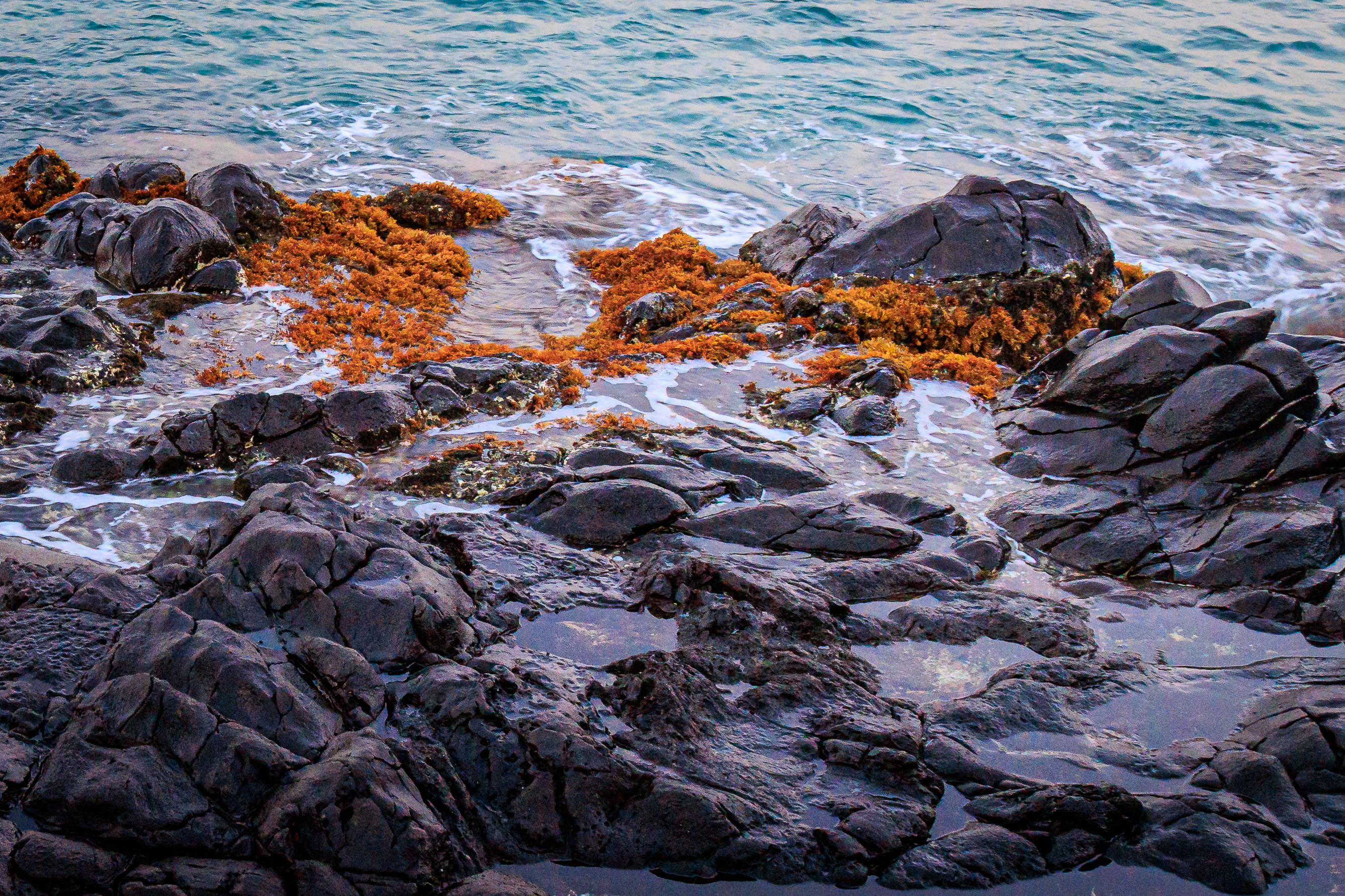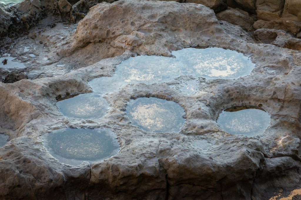 Several days later, I spent some time on the pathway again and stopped about midway to take these two photos showing both the before and after of the tidepools being refreshed by the bay (use your mouse to move the center line to the right to see the before, and the left to see the after, of the changing tide — both images 1/10 sec, f/16, ISO 2000).
