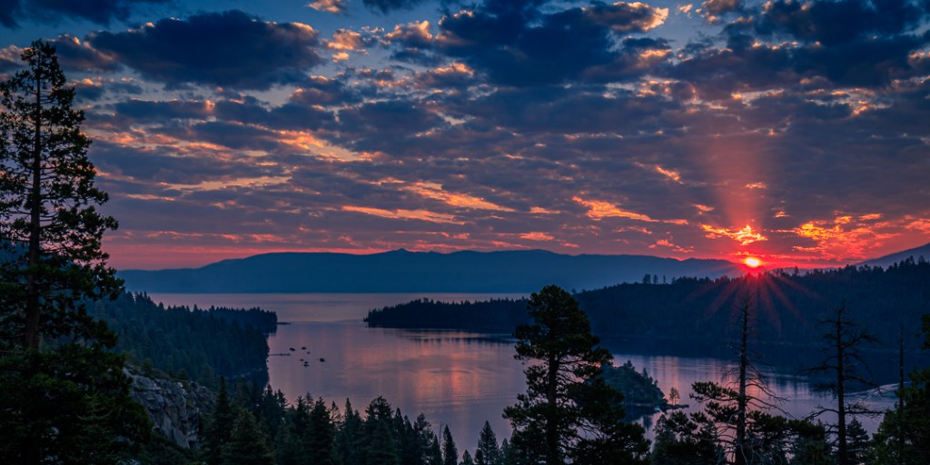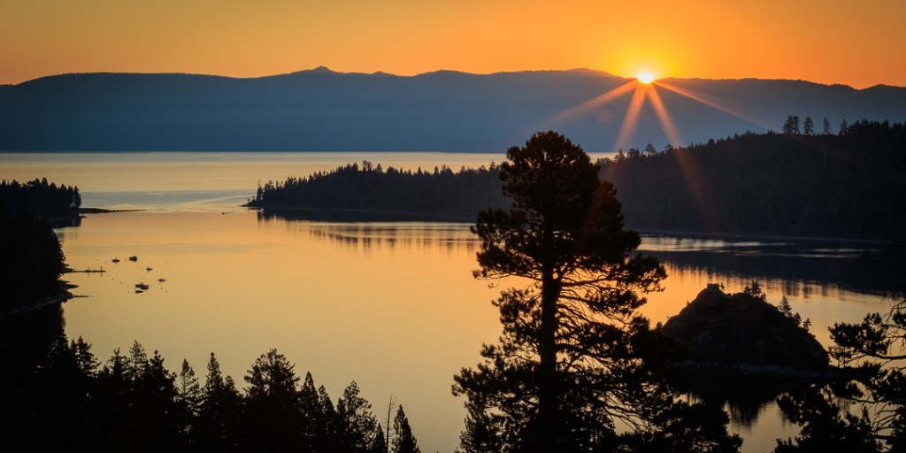 Since the trails were declared closed at just the time when I was hoping to use them, I spent a few minutes thinking about an alternative location and, since it was still quite early, decided to drive around through the south end of the lake, past where we were staying, to the area in California above Emerald Bay (marked on the map with a ⭕, 2️⃣, and 📷 — the camera to indicate that I actually took photos there). I arrived there a bit before 6 AM, parked near the trailhead for Eagle Lake, crossed the highway, and setup for the shot at the top of this post.