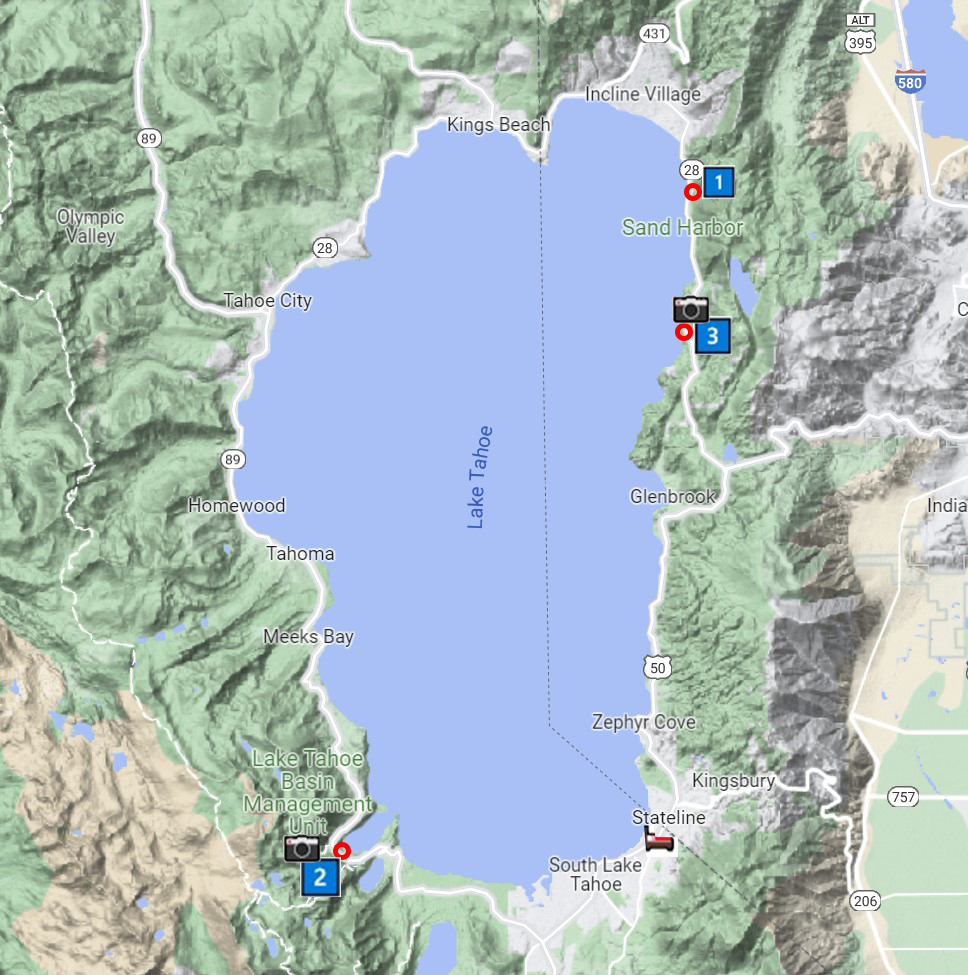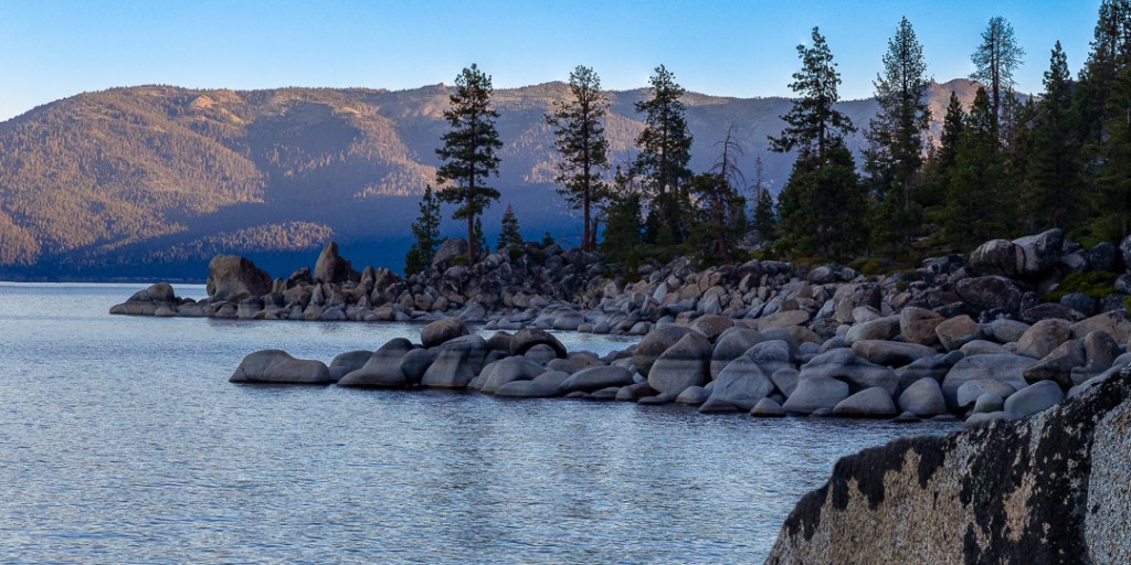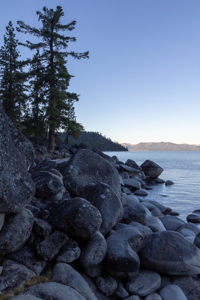 We were staying in South Lake Tahoe, very near the state line between California and Nevada on the California side (marked on the map by the little bed icon). I had a specific location in mind for shooting that morning on the Nevada side of the lake, called Memorial Point (marked with a ⭕ and 1️⃣). I’ve tried shooting up there in the past and, among other issues, I had always underestimated the time it took to drive there (so this time I left at about 4:15 AM, determined to get there well before sunrise). My intention was to use the Point as a base, and to hike both north and south along the shoreline trails looking for a spot to shoot some of the many granite boulders that seem to just naturally line the shore.