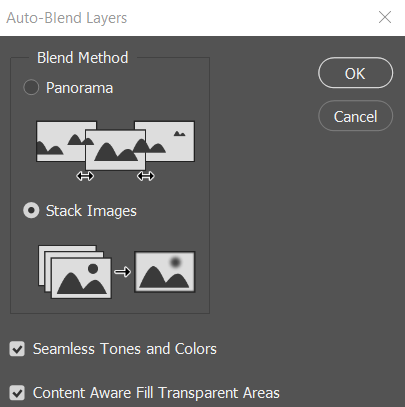 - This will bring up the Auto-Blend Layers dialog (see Figure 5, below) which normally figures out that this is a request to blend stacked layers, so the Stack Images option is checked as are the Seamless Tones and Colors and Content Aware Fill Transparent Areas options (if they are not, please check them). The Content Aware option is designed to fill in any blank (transparent) areas by using related content from within the image.