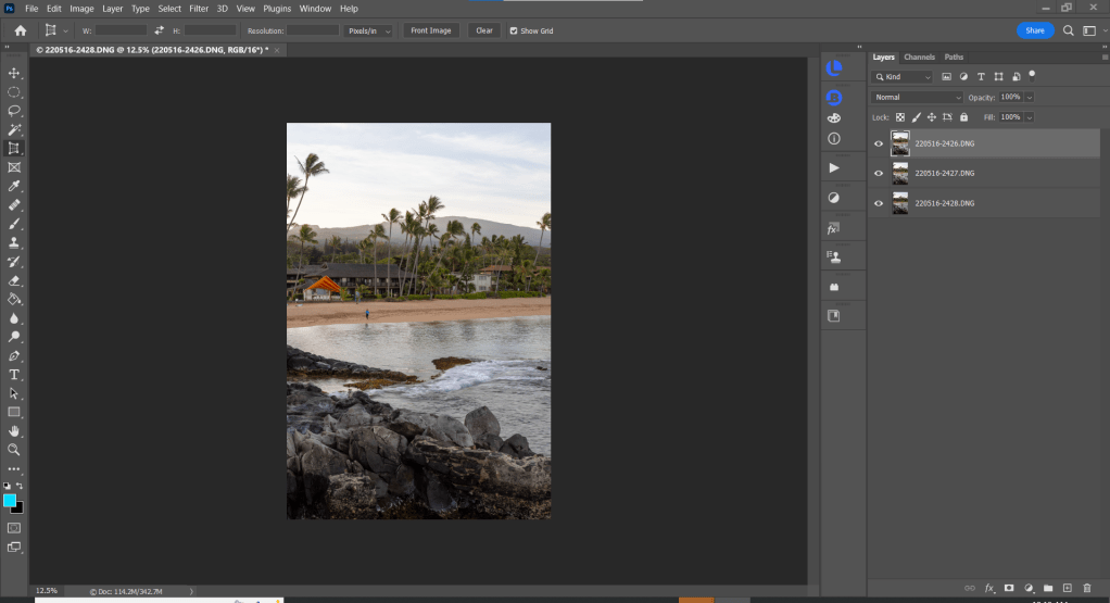 - Then the images are sent to PS and aligned as layers in a single photographic document.
