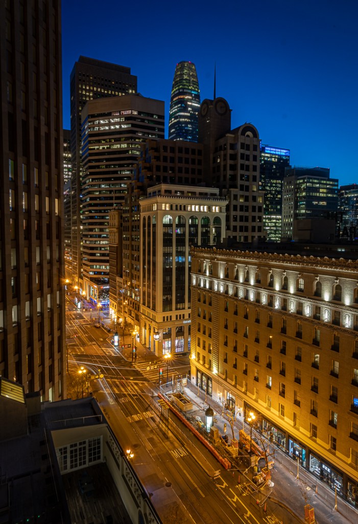 We took a road trip with our travel buddies, Louise & Lew, that started with a stay in San Francisco (with wine country side trips), another few days in Monterey, and finally ended up in Las Vegas, Nevada. That entire trip is reported in my blog post, February 2022 Road Trip. In addition to the photo at the top of this post, my other downtown San Francisco favorite from that trip is this other, even earlier shot of Market Street at dawn. Interesting to me, is the way that early morning “blue hour” light from the pre-dawn sky is completely eclipsed by the intensity of the electric light along the street and nearby buildings.