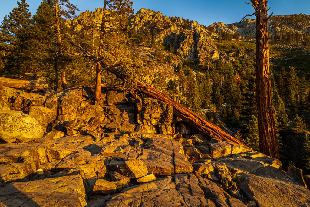 Sunrise lights up granite mountains and forest growth above Emerald Bay