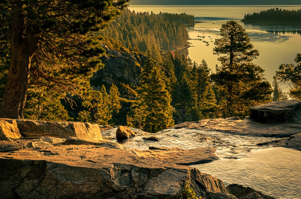 On both trips I spent time photographing above Emerald Bay (on the California side of the lake) and on the Nevada side but closer to the shoreline. My two favorites from the August trip are both from the area above Emerald Bay. The first one is focused on how low the amount of water is coming down to the lake via Eagle Falls but also shows Emerald Bay in the background.