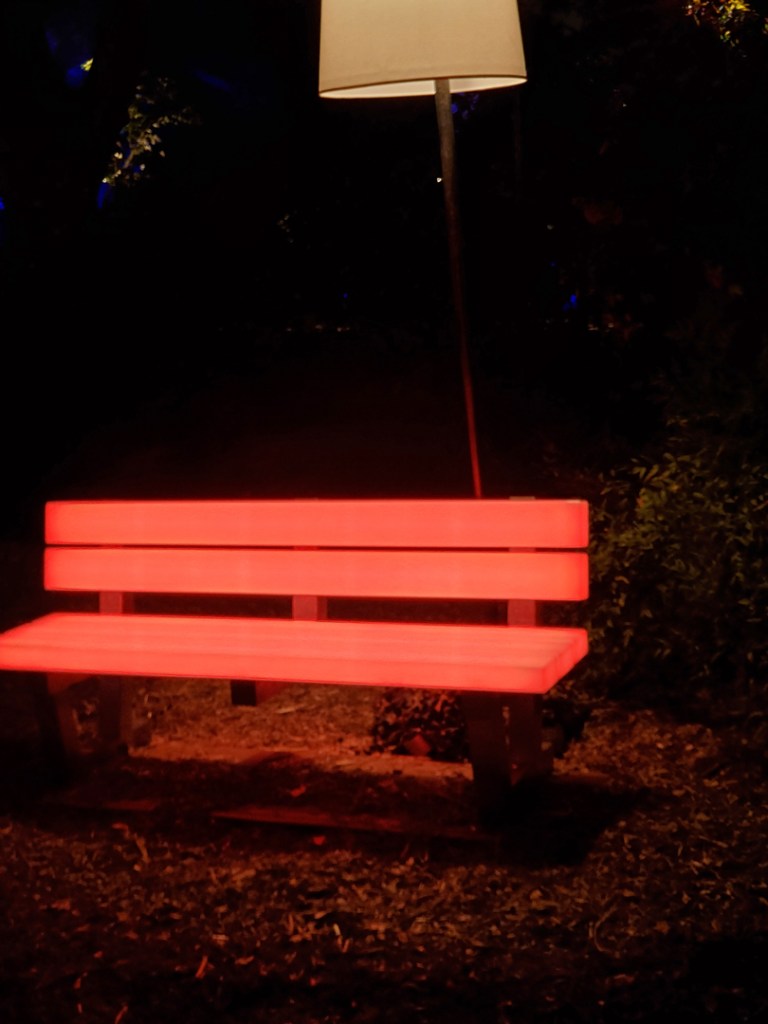 Around this time of the evening, I stopped using my full camera (maybe I was tired of carrying it around or maybe the battery was dead – I don’t really remember). So I took a final few photos using my phone. These two images were taken at two different stations. The first was another interactive station where people (mostly children) would walk around the platform (maybe stomp around) and the lights would change to light them and the tree they were circling to change color. The other was a kind of park with benches, except the the benches seemed to be fully lit from within while also being illuminated by standing lamps. [On these camera photos, I let the camera app control everything except focus –exposure, shutter speed, and ISO- so I don’t show that metadata here since I had no hand in setting it.]