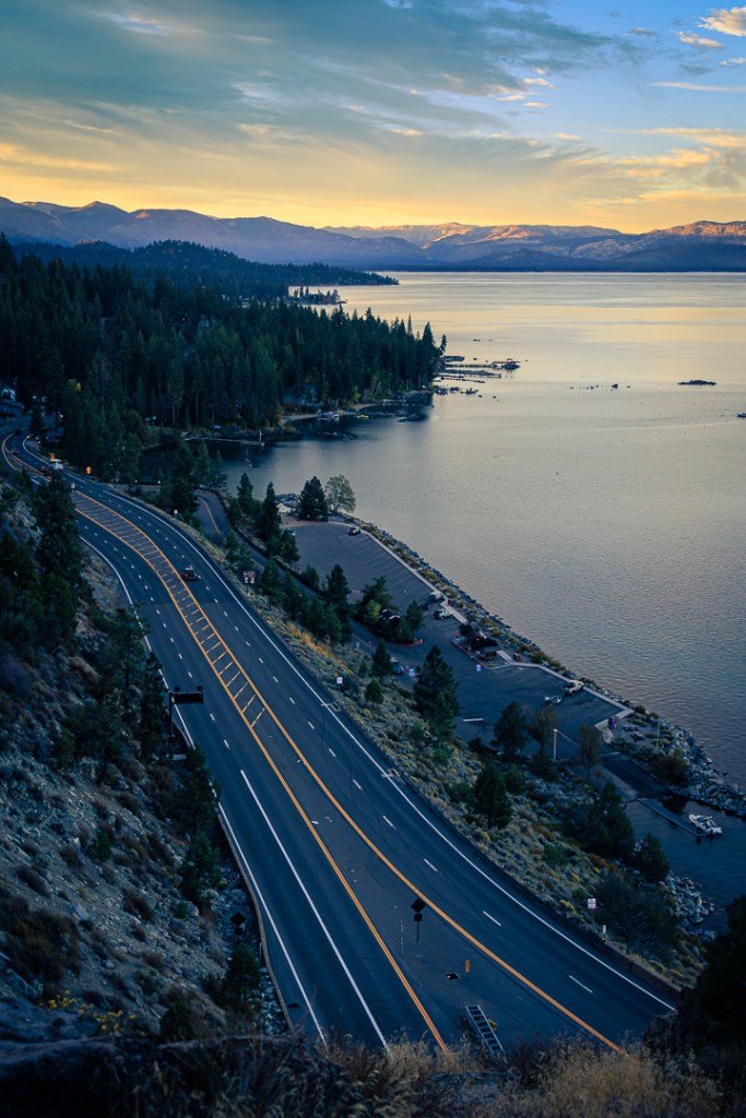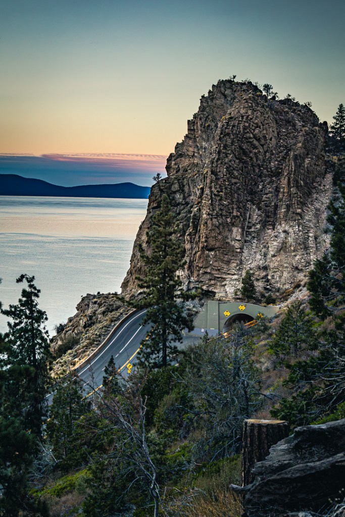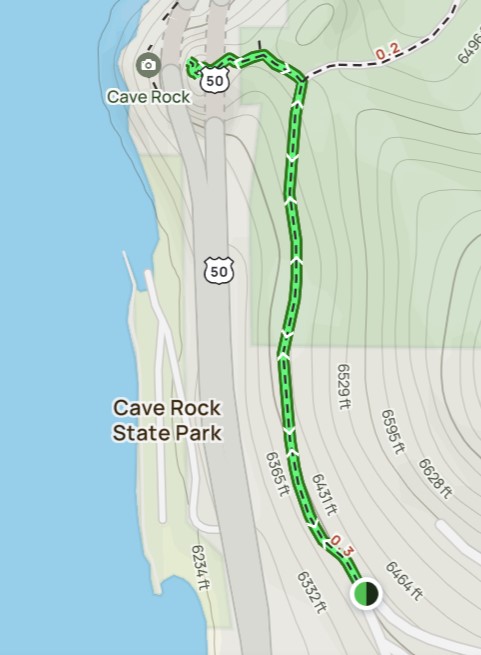 Two days after the Lower Eagle Falls hike, I was up at zero-dark-early again, this time headed for a much shorter (and easier) hike to a scenic overlook on the east shore (Nevada side) of the lake and only about a 7 mile (12 minute) drive away from our hotel — the Cave Rock Trail. The trailhead is found at a sharp bend in Cave Rock Drive, a short drive up the hill, off US 50.