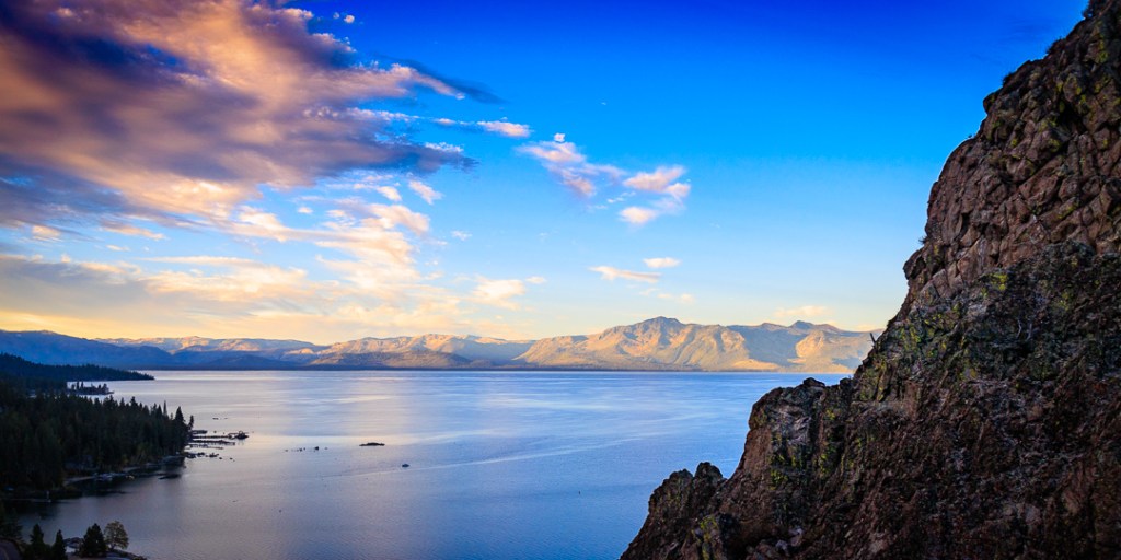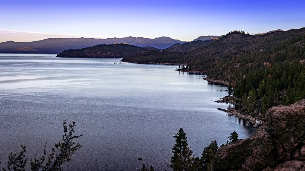 Above is a slideshow of those three images: The rock scramble just seemed like a poor choice (I’ve climbed other scrambles that were at least as difficult in other circumstances but this one just seemed too risky versus the insignificant advantage of simply reaching the top). The south-facing view includes Cave Rock State Park which includes a parking area, a swimming area, and a boat-launch ramp. The north-facing view includes a large portion of the eastern shore line and well as the mountains above North Lake Tahoe (just beginning to receive direct sunlight).