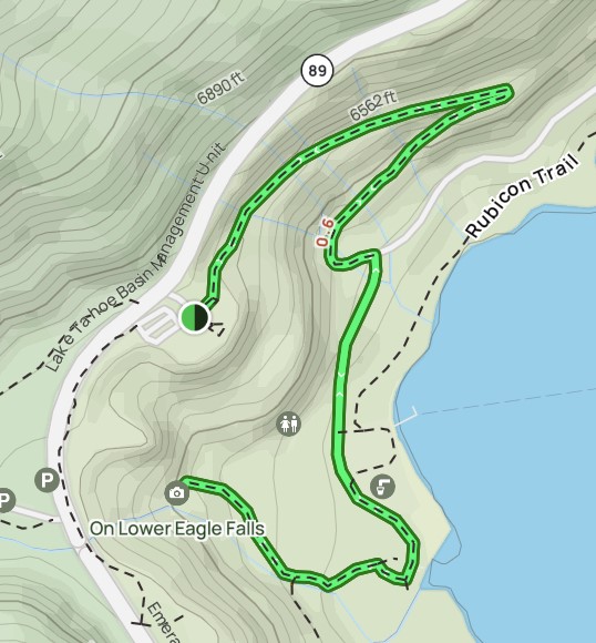 The morning after our arrival at Marriott’s Timber Lodge in South Lake Tahoe, I was up, dark and early, and on my 30 minute drive (about 14 miles) to the Emerald Bay State Park Lookout where I’d find the trailhead for the Vikingsholm Trail to Lower Eagle Falls (that is, one hikes down a wide trail –more like a well maintained fire-road– to the Vikingsholm Castle area and then shifts to a narrower, more woodsy trail up to the Lower Eagle Falls Overlook).