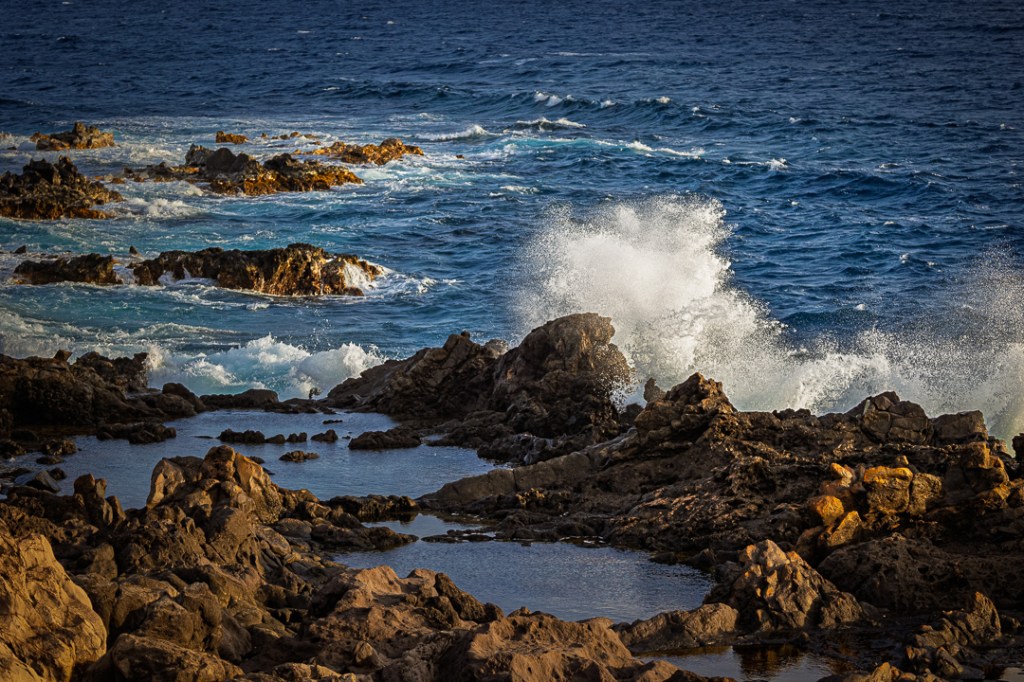 I spent quite some time exploring the area and looking for birds. I saw a few, mostly sitting on the ground and just one or two flying too far away to photograph. So, I just continued to explore and think about coming back another day. I also climbed on some of the more rocky areas further out toward the tip of the Point (that’s where my hiking stick became most useful) and eventually reached the Kapalua Tidepools. That, of course, tickled the landscape photographer in me and I did take this image of some small waves crashing against the rocky edge of the tidepools. This image was captured at 6:30 AM. As you can see the sun is already up and casting warm morning light on some of the rocks.