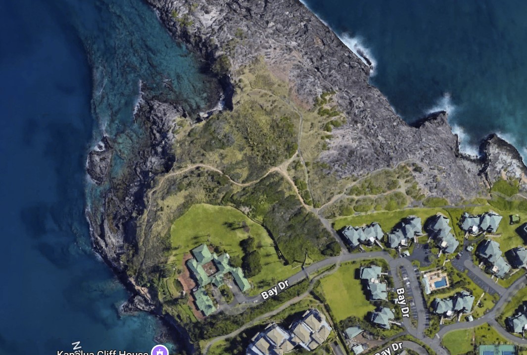 Walking that trail at any time of the day, you will often see other hikers or runners, but more often at the edges of the day, when the temperature might still be at a comfortable low 70 degree’s. I’ve included this view primarily to identify the locations where all the photography shown in this post took place. A few paragraphs below, I also provide a satellite view #2 that provides a bit more close detail of the area at the top-left of this view #1, between Ironwood Cliffs and the Kapalua Tidepools. Although it is not indicated on the map, that area is called Hawea Point and is about a mile or more, from our room.