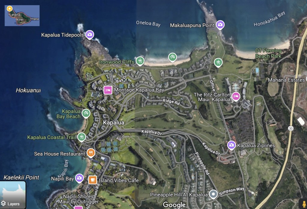 I’ve included the below annotated satellite view of the area around our ‘corner’ of Maui (courtesy of Google Maps) and included a tiny insert in the upper-left corner showing all of Maui with a circled star indicating the approximate location of it on the island. In the lower-left of the map you can see Napili Bay identified, as well as the Sea House Restaurant (which is an integral part of the resort property). Just above that, on the map, is the southern entrance to the Kapalua Coastal Trail (just on the northern edge of the resort). That trail heads north following the coast until it reaches the area labeled Ironwood Cliffs, where it turns east and continues to follow the coast until it reaches its end at DT Fleming Beach Park.