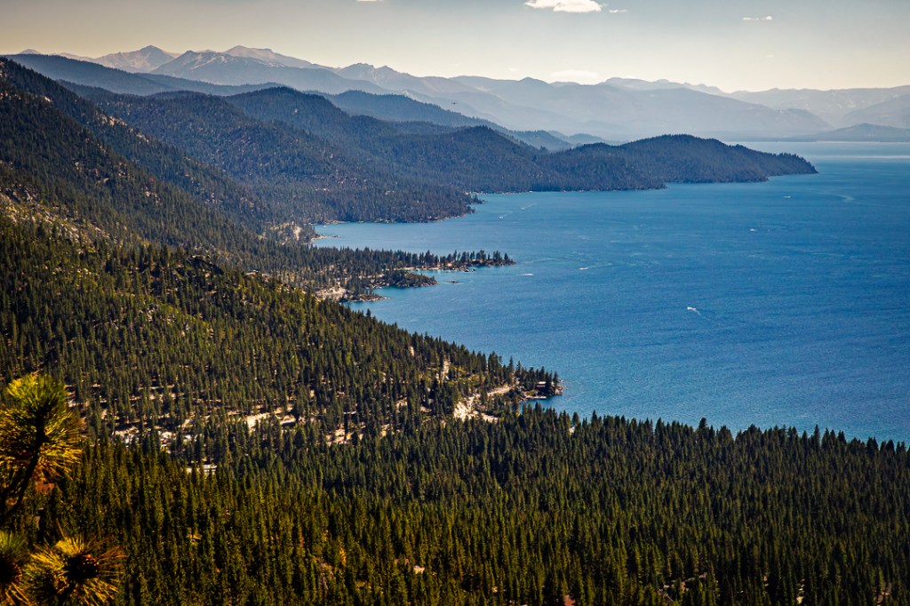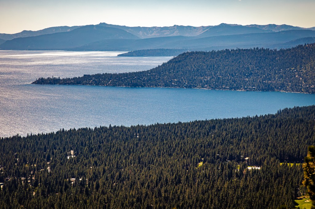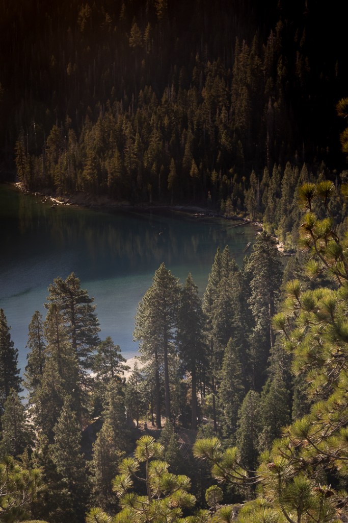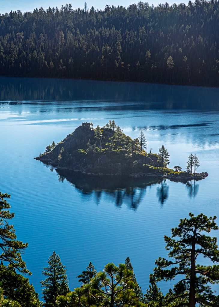 I took two different photographs of Emerald Bay from that perspective; one focused primarily on Fannette Island and the other facing directly down, toward the Vikingsholm Beach. At the peak of the island (the only island in Lake Tahoe) you can see the ruins of a small stone building. That ruin is called the “Tea House,” constructed by Lora Josephine Knight, the former owner of Vikingsholm. The photo of the beach is somewhat obscured by the number of trees and the angle of the shot. But it is possible to see a hint of the Vikingsholm Castle hiding under the trees.