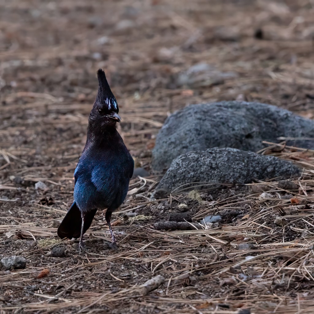 Fortunately, I had mounted my longer 100-500mm zoom lens in hopes that I might come across a bird or more to photograph. And, as it happened just a bit further along this trail, a Steller’s Jay flew down to the ground a short distance in front of me, to seek some breakfast.