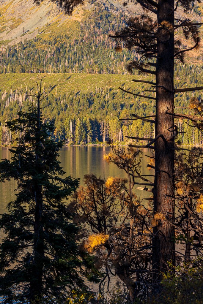 Not long after the bird encounter, I decided to try to get closer to the lake. Traveling south, as I was, I was aware of a kind of berm or natural ridge that extended steeply up, to my right. The next time I came to another branch in the trail that faced up the ridge, I took it. It turned out to be as steep as it appeared but not that high. It was only up about 60 feet (or a bit more) and then it rounded and headed down toward another branch of the trail that seemed to follow the lake’s coast fairly closely. The image on the left is my first view of Fallen Leaf Lake (at least on this trip).