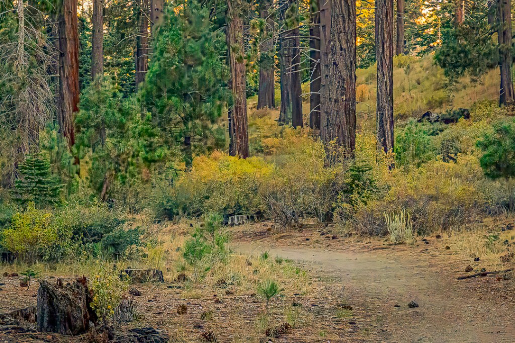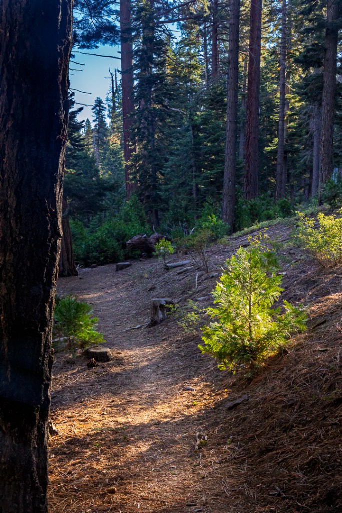 The forest was quite dense, not allowing much view of distant objects at this point but my general sense of direction told me to continue straight ahead and I’d probably soon see the southern road of the Fallen Leaf Campground — which I did, and it worked well. After that, the trail paralleling that road took me directly back to my car and I headed back to the hotel to join Billie for breakfast.