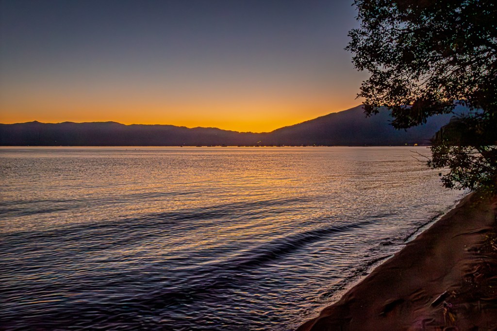 I thought to myself that I still ought to try and see what sort of sunrise shot I could get before we left for home in just a couple more days. So, I set a very early alarm, and the very next morning, in the very dark and quiet, drove over to Kiva Beach on the south shore of Lake Tahoe. It was still quite dark when I got there, so I carefully hiked around the area, seeking a shooting position along its very narrow beach. As the eastern sky began to show some light, I settled on the spot shown in the image below, and waited for the sunrise. Eventually, just before 6:30 AM, there was enough light in the sky to support a photograph, and I captured this cloudless, pre-dawn sunrise.
